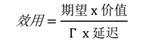 心理学家Steel和König在2006年,结合了前人的理论假说,提出了变化动机理论(Temporal Motivation Theory)。他们认为,任务的效用(也就是我们通常所说的行动动力)会取决于以下几个因素:个体对自己能否完成任务的期望(我有没有可能完成任务)、任务的价值(完成这件事能带来多大的好处)、结果的延迟性(要多久才能见到任务结果)以及个体对于拖延的易感性(Γ,属于心理因素,也就是个体出于某种心理原因,主动选择去拖延)。任务的价值越高,个体对自己获得正性结果的期望越高,越是能尽快得到结果,个体的拖延易感性越低,任务的效用就越大,则个体的拖延行为也越低。