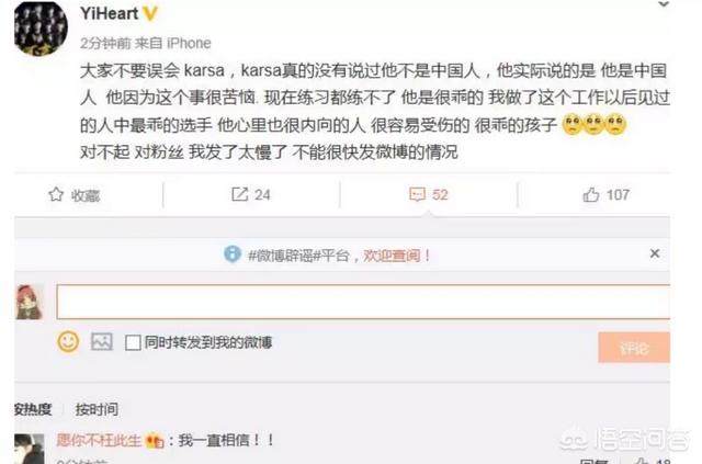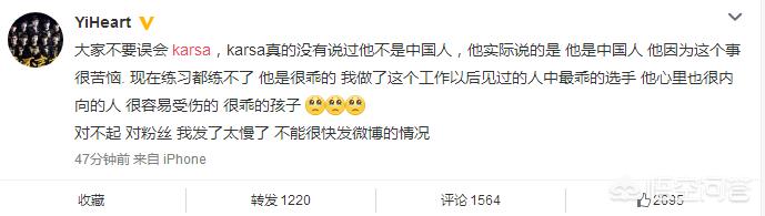 在今天晚上11点左后,Heart教练终于忍不住了,他站出来说“大家不要误会Karsa,Karsa真的没有说过他不是众人,他实际说的是他是中国人,他因为这个事很苦恼,现在联系都连不了。他是很乖的,我做了这个工作以后见过的人中最乖的选手,他心里也很内向的人,很容易受伤的,很乖的孩子