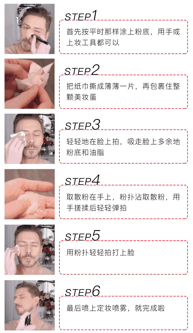 做法:用化妆蛋蘸取散粉,多一点没关系的,厚厚打在你化好的妆容上,让他们在你脸上停留5分钟,散粉能吸收多余分泌的油脂。然后再轻轻涂匀它们,你的妆容会更持久。