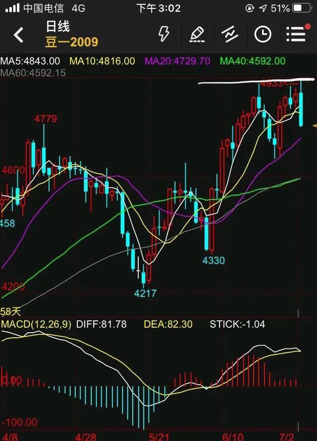 上图为豆一的走势图,可以看出这周的豆一一直处于上涨中,尤其星期一一根大阳柱,突出了多头的资金流的猛烈,有心的朋友朋友可以看一下,可以看出当天有多少人做空被杀了,那些下降压力都是一个杀人于无形收割机器,(作者也想做空,但是受限于自己的规则决定忍住了,所以还活着)之后的星期一到星期四,做空的依然送死,多头依然在,拼命吊住一口气,稳步小匀速上涨!
