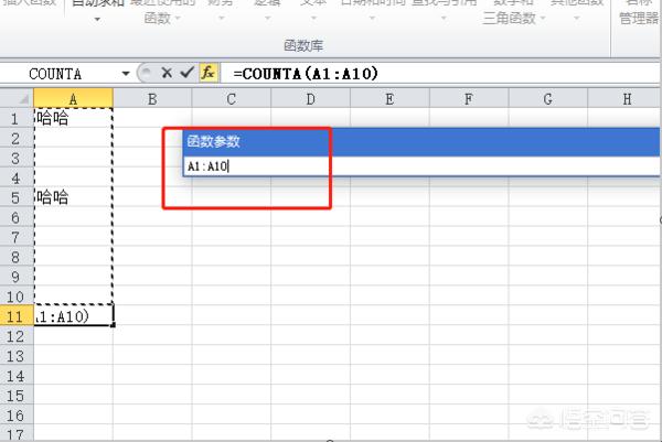 6、然后选择要计算的区域范围 A1-A10,再点击框的右边回到刚才的函数设置界面,然后点击确定按钮;