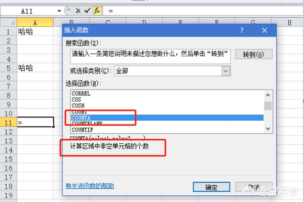 4、然后在弹出的插入函数设置框,找到COUNTA函数,该函数表示计算区域中非空单元格的个数;