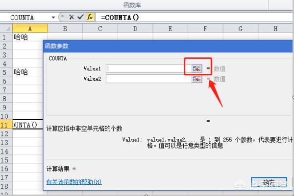 5、在弹出的“COUNTA”函数设置页面,点击“value1”右边的方框(红色箭头的方框符号)选择需要计算的列;
