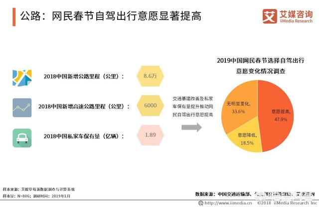 iiMedia Research(艾媒咨询)数据显示,47.9%的受访网民表示2019春运期间选择自驾出行的意愿显著提高。艾媒咨询分析师认为,人们生活水平提高,私家车保有量不断提升,同时国家加强公路建设,春节自驾出行增多的趋势明显。