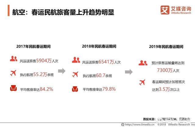 数据显示,近年春运期间,民航运送旅客量呈现明显上升趋势,2019年预计运输旅客量达到7300万人次,春运期间将加班班次3.5万次以上。艾媒咨询分析师认为,随着人们消费能力提升,以及航空交通运输业务发展趋于成熟,在春运期间选择飞机返乡和出游的人次上升,未来民航将成为人们春运出行重要选择方式。