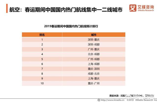 2019春运期间,中国国内热门航线主要集中在深圳、重庆、北京、广州、成都、上海等一二线城市。