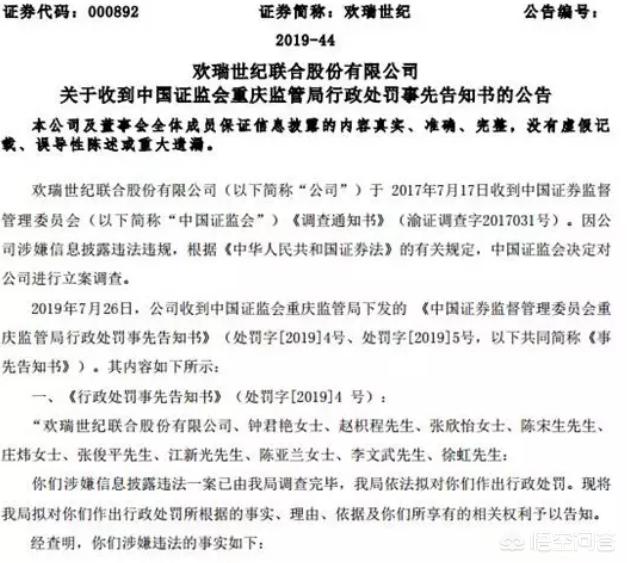 最终重庆证监局决定:拟责令欢瑞世纪改正,给予警告,并处以60万元罚款;对公司实际控制人钟君艳给予警告,并处以30万元罚款;对欢瑞世纪相关董事及时任高管赵枳程、张欣怡、陈宋生、庄炜、张俊平、江新光、陈亚兰、李文武、徐虹给予警告,并分别处以5万元罚款。