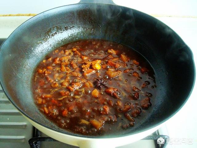 5、加老汤一勺(没有可以不加)加水(可以多加,还要用汤汁拌面条),加一小块冰糖这样味道鲜美,熟透后汤汁浓稠