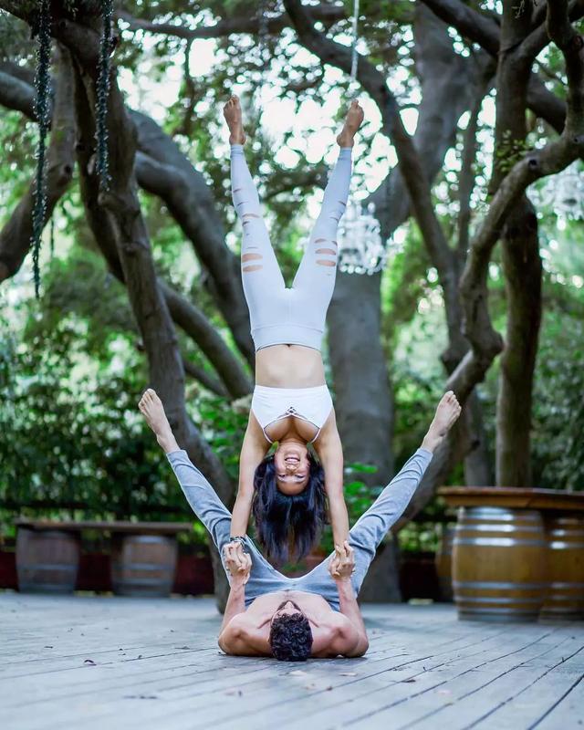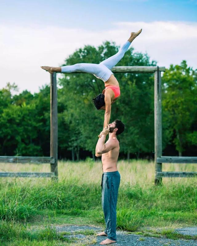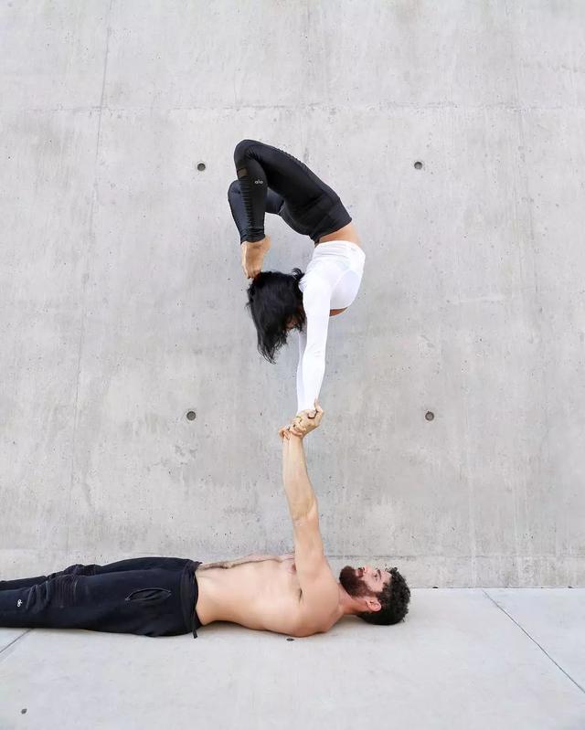一个手掌上的简单倒立,既考验了男士的手臂力量,也是对双方之间的信任程度的检验,小小提醒一下,“绷直”是一个长时间坚持的秘诀哦。