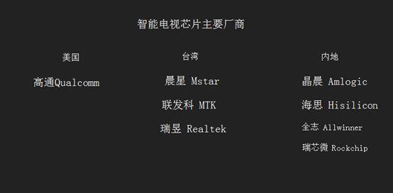 Mstar 是电视芯片中规模最大,销量最高,技术实力最为雄厚的芯片厂家,类似手机芯片中高通的地位。MTK 在电视芯片中的造诣也比较高,要找手机芯片中作比较的话,还是 MTK。Amlogic 是三家中,技术实力比较差的厂家,要找类似的话,可能就要往手机芯片中的瑞芯微这样的找了。其他,如海思等也有电视芯片的方案,但时间还不长,处于技术积累。