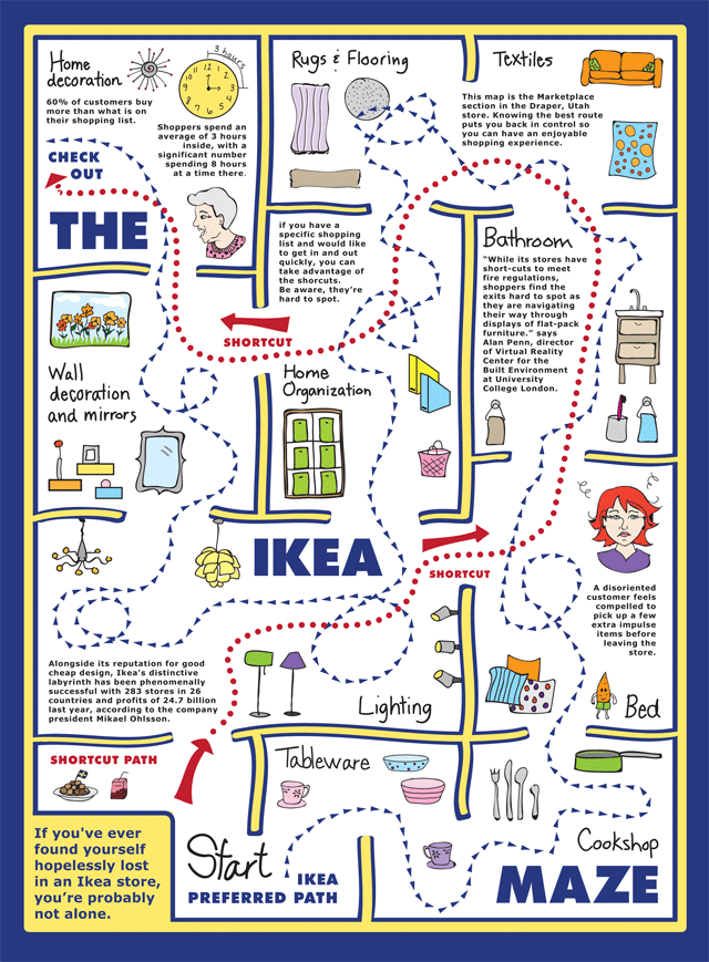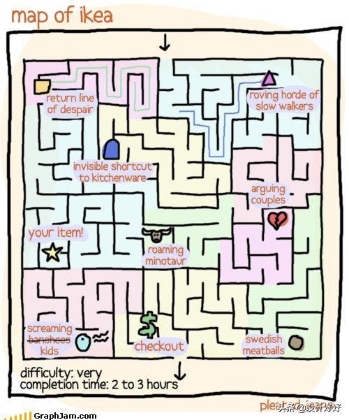 其实很多商场也存在这种导向式设计,目的让客户更多的停留在商场,进行货物的挑选,增加客户购买的几率。只是对于宜家这种大卖场,少了一些必要的导向标识,其实第一次进宜家的人,多少会感觉到有点累,因为确实琳琅满目的商品,迷宫式的布局,很容易找不到北。