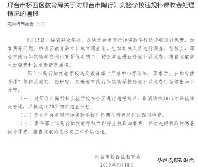 2019年9月18日,河北省邢台市桥西区教育局发布了《邢台市桥西区教育局关于对邢台市陶行知实验学校违规补课收费处理情况的通报》: