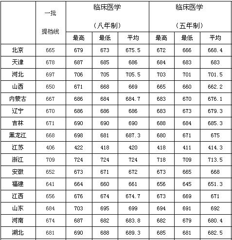 小编再给整理一下北京大学医学部临床医学专业2016年的分省录取分数线: