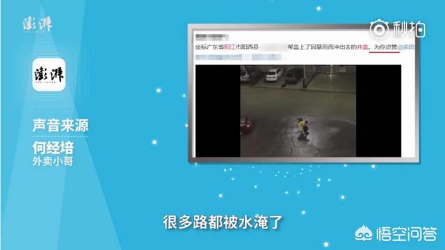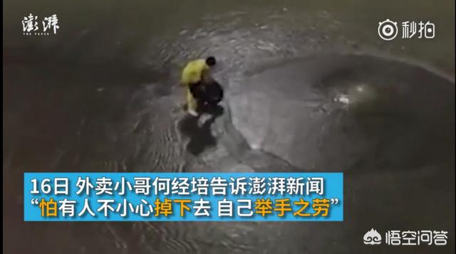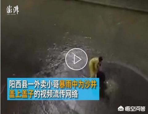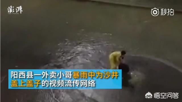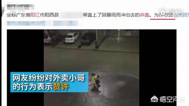 外卖小哥暴雨漩涡中为沙井盖上盖子,防止行人脚淌混水,看不清道路,掉进井桶,酿成事故。此举事小,而善莫大焉,在金欲横流的今天,不愧为人心向善的一大义举。