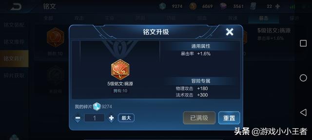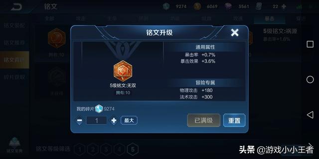 另外七个铭文使用祸源。祸源的属性是增加1.6%暴击率。这样配合3个无双铭文,前期的暴击率达到了13.3%。这个收益是非常大的。要知道,很多职业选手和玩家,都喜欢九个异变加上一个祸源。因为暴击伤害翻倍,如果运气好,祸源会带来意想不到的效果。