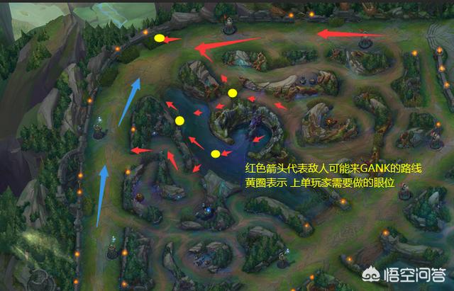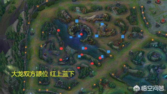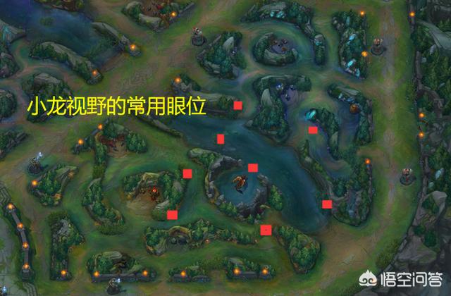 中期:中期小龙还没打的话,可以把小龙周围的视野都做了,根据不同的方位做不同地方的眼,如下图。在时刻保证下路视野的时候,也要尽可能把眼做到敌方野区,来获得敌方打野的动态和防止对面中单下来GANK。