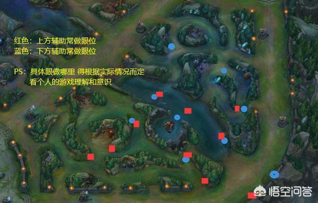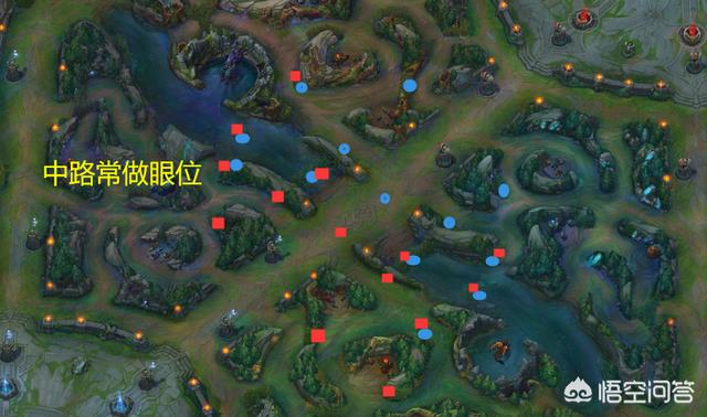 在下路不需要守AD发育,也没有小龙的时间段,可以把视野做到中路,同时帮中路GANK。常做的眼位如下图,具体做在哪里根据实际情况选择。