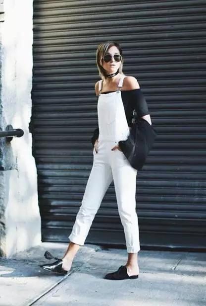 如果实在不喜欢高跟鞋,那就换上舒适的平底懒人鞋吧,但一定要记得将裤脚卷起来,才能拉长你的身高哦~一字肩搭配背带裤,似乎别有一番风情!