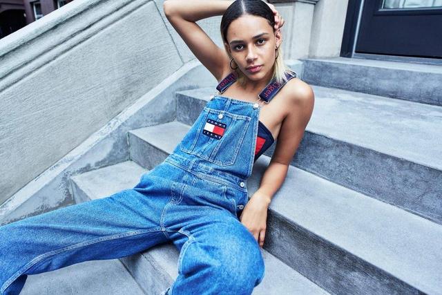 尝试一下露脐T恤搭配牛仔背带裤,把一边的背带放下来吧!