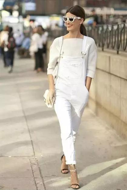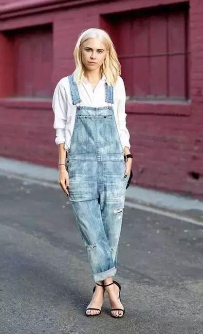 白衬衫搭配牛仔背带裤给人的感觉,既休闲,又不缺乏干练型的女强人,小跟鞋展现出魅力女人气质范儿,记得把裤脚卷起来哦~