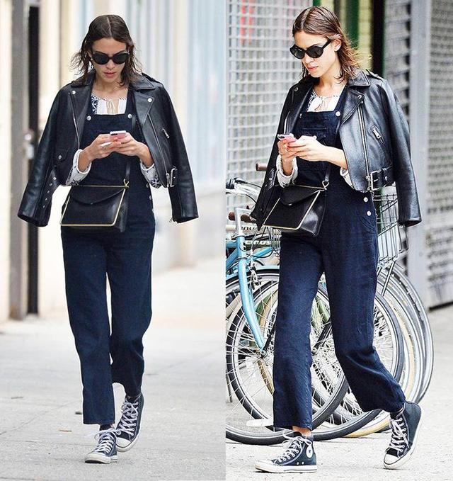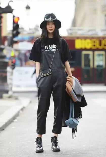 背带裤和紧身裤的组合,简约大方,完美地展示出细直长的腿,原本中性风的造型穿出了小性感。