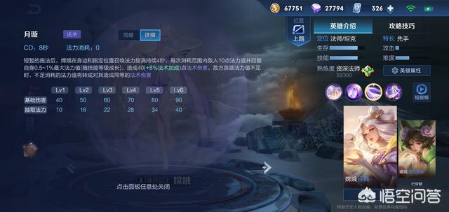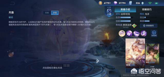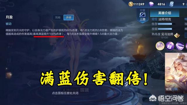 被动效果:嫦娥的法力值可以产生护盾帮其抵挡60%的伤害,法力值越高输出伤害越高,满蓝的情况下提升100%的伤害。