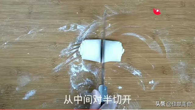 揉好后,分成4个大小均匀的剂子,然后把4个剂子都揉圆。取出一个揉好的剂子,擀成牛舌状,厚度0.5cm左右,然后涂抹上油酥,卷起来,按扁,竖着擀开,擀成长条,这次要尽量擀薄,擀好后,从一头卷起来,从中间对半切开。