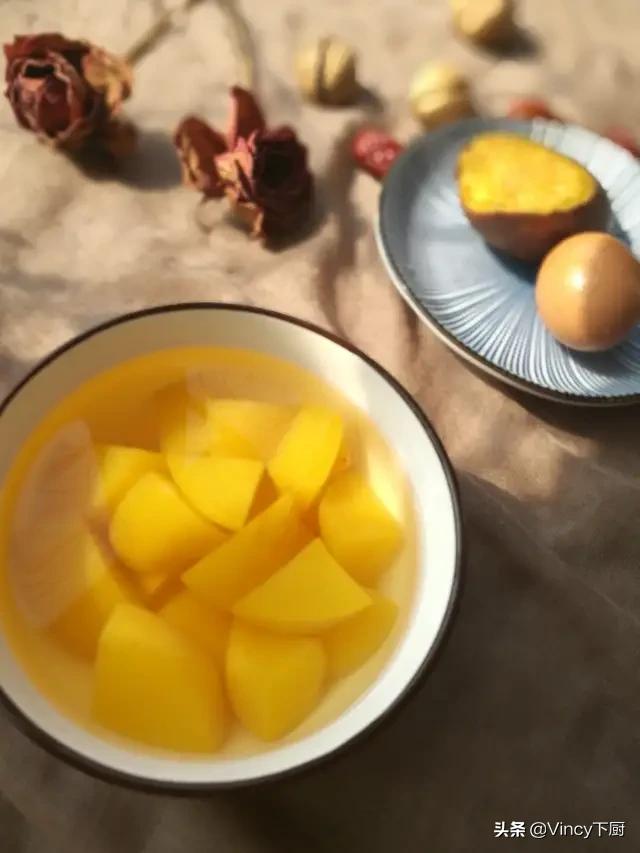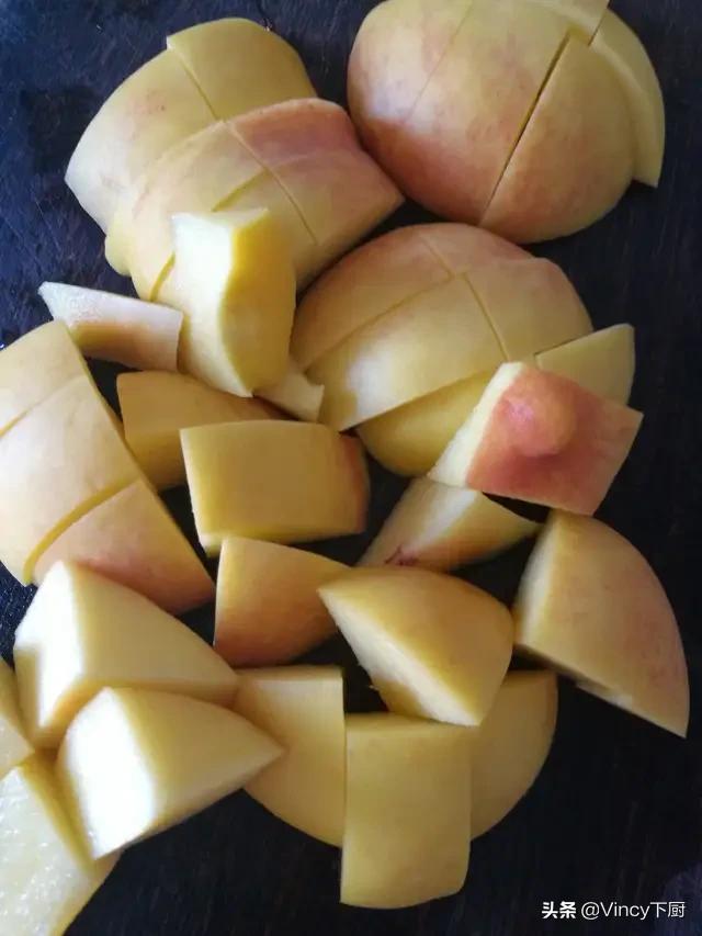 ①、黄桃用盐水浸泡5分钟去掉表皮的农药,再用清水洗净,剔除核后切成小块。黄桃选较硬有点酸的煮出来更好喝。