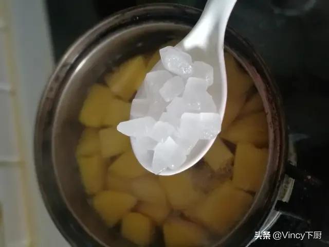 ②、奶锅里三碗水,再放入黄桃块和冰糖。水淹过黄桃一指长,2个黄桃煮熟后正好煮成两碗汤。