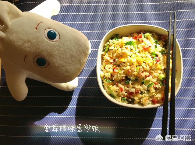 首先,要选好米!食材是美食的基础,是源头,我觉得稻花香的就可以,或者是泰国香米,绝不是做广告哈!其次,选好了食材,关键就是蒸米饭了,可以选择剩米饭,但是不能是水了吧唧的那种,软踏踏,炒起来发粘,不利落不说,口感也是极差。如果是剩米饭来做的话,一定要提前用筷子挑松散,实在是成块的话,可以加少量水挑松再炒!当然,个人认为做炒饭,还是喜欢那种捞饭来做,就是先用水煮一下大米,煮到还有一点硬心的时候,捞出来,放在屉布上锅蒸熟,这样蒸出来的米饭,粒粒分明,晶莹剔透,入口很有弹性。蛋炒饭具体怎样做好吃呢?分享一下我的金蒜腊味炒饭的做法: