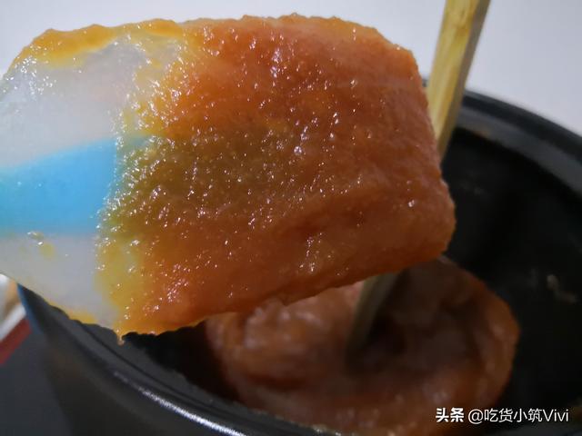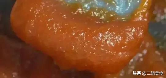 所以熬山楂必须熬至能够在刮刀上“挂住”,滴落下来比较困难,而且看起来很浓稠的时候才可以停止,具体如下图所示。