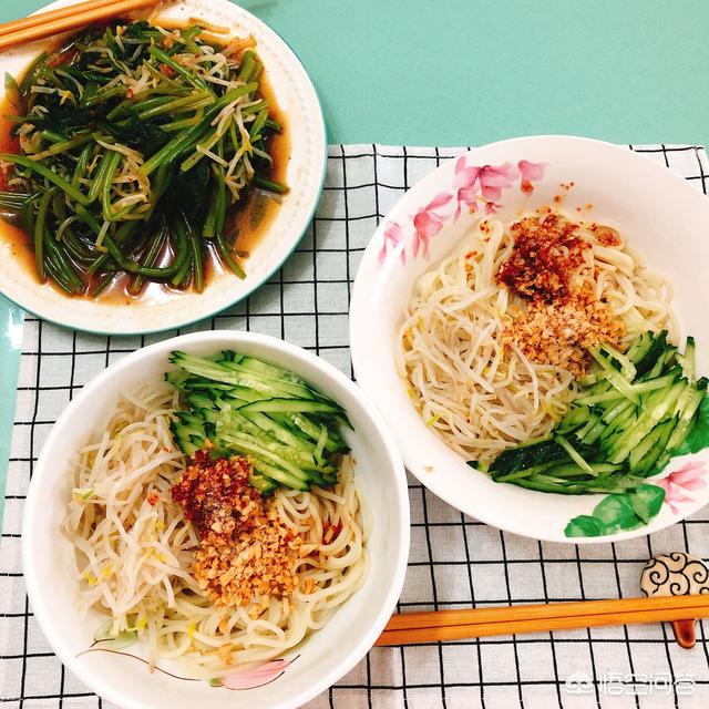 做凉拌面,煮好的面条,用风扇吹干,或者用油拌一下,面就不会坨了。黄瓜切丝,豆芽过水焯一下。炸香喷喷的红油,花生压成面儿,姜蒜捣成泥,糖、盐、麻椒面儿、酱油、醋,统统放到面上,拌匀,满足的味道和口感哇。加芝麻酱和鸡丝也不错鸭。
