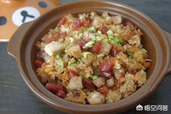出锅后拌匀,然后撒葱花。香喷喷的腊肠糯米饭。