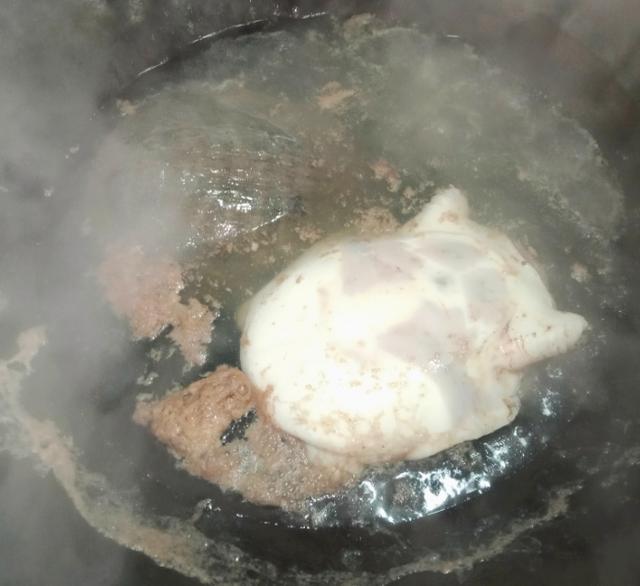 8、炒过的甲鱼肉放入砂锅里,再放入猪肚、甲壳,加入适量清水,大火煮开,撇去浮沫,小火煮1.5小时。