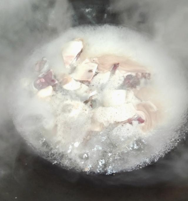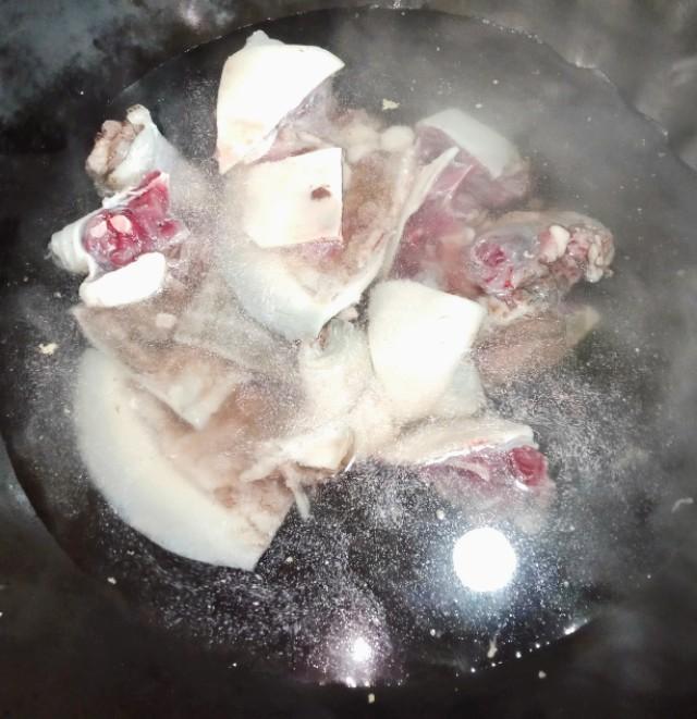 清理干净后用清水洗干净,锅内加入水烧开,放入甲鱼30秒左右捞出(小贴士:过水的作用是清理甲鱼身上的表皮,过水后就能看到表面有一层白色的皮,这个表面的皮是比较腥)