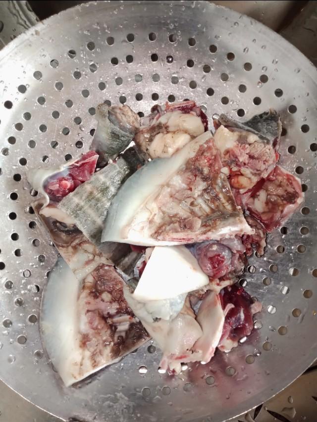 3、 宰杀初步处理后,斩成块状,入锅中加入白酒,或花雕、茶叶水,煸炒至水分蒸发干,取出飞水即可去腥。