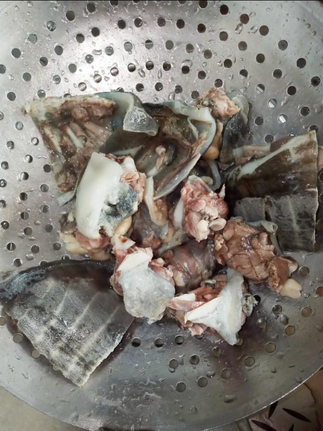 捞出后用冷水洗一下,用手吧甲鱼表面的老皮去除掉。(小提示:用手摘不下来可以用钢丝球刷一下就掉了。)