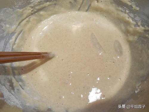 3、连同冰块一起倒入面粉里,搅拌均匀,冰块就这样给它摆着没关系,然后整盆放入冰箱冰半个小时,要用之前再从冰箱取出,重新搅拌一次