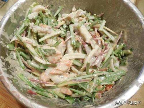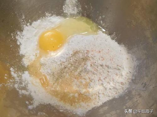 配料:中筋面粉一杯、地瓜粉一大匙、很冰很冰的冰水一杯、冰鸡蛋一颗、盐、白胡椒粉各一小匙、蒜粉一小匙