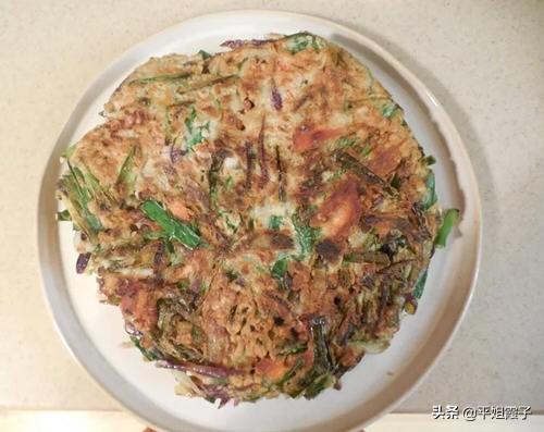 用料 韭菜一小把胡萝卜1/3根角瓜1/3根,可不放尖辣椒半个洋葱半个白面300克糯米粉100克煎炸粉1勺盐适量步骤1准备材料步骤 2韭菜切段,角瓜胡萝卜洋葱辣椒切丝,不喜欢洋葱可以不放,不能吃辣可以不放辣步骤 3放入面粉,糯米粉,煎炸粉搅拌步骤 4搅拌成糊状,看不到明显面粉颗粒步骤 5把切好的韭菜角瓜等材料倒进面糊盆,搅拌均匀步骤 6平底锅烧热,倒入少量色拉油,油量不要太多,以不粘锅为宜。