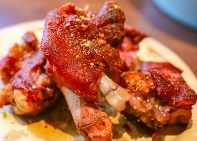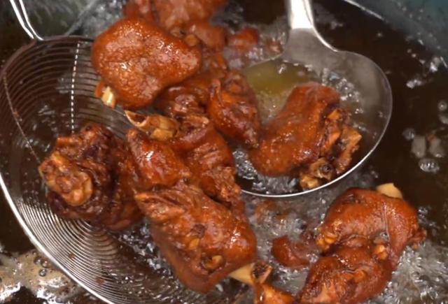 等到整个猪手变成漂亮的金红色时,用筷子敲一下,感觉脆脆的,就可以出锅了