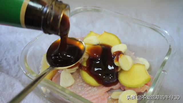 鸡腿肉放入料酒 耗油 姜片 白糖 盐 胡椒粉 用手抓匀腌制10分钟