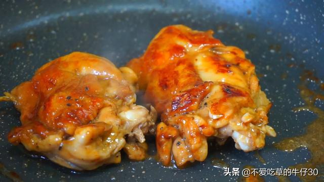 3. 腌好后放进不粘锅煎2分钟翻面,不用油(鸡皮有油),加入腌鸡腿的酱汁,小火焖十分钟