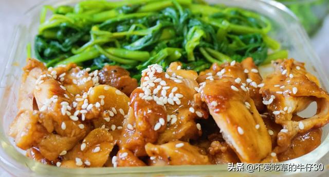 5. 准备一个便当盒,先盛出米饭,来点青菜,放入鸡块,淋上锅里剩余的酱汁,撒点芝麻,呈现出一份完美的便当~开吃[送心][送心]