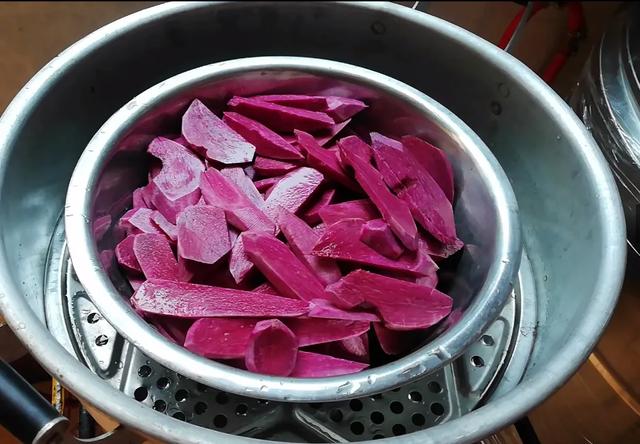 1,红薯去皮清洗干净,然后切成片状,放在蒸锅上蒸熟。