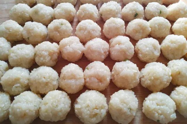 ==》用手沾蛋液,把米饭捏成一个个小圆球状备用。