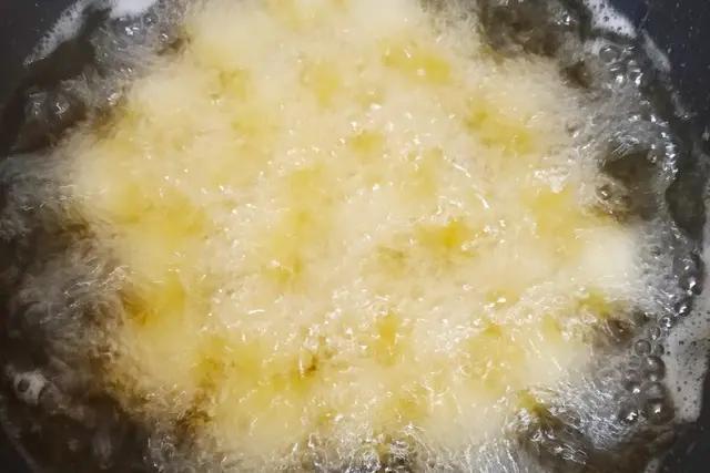 ==》锅中油温6成热时,下入捏好的丸子小火慢炸,表面金黄即可捞出。