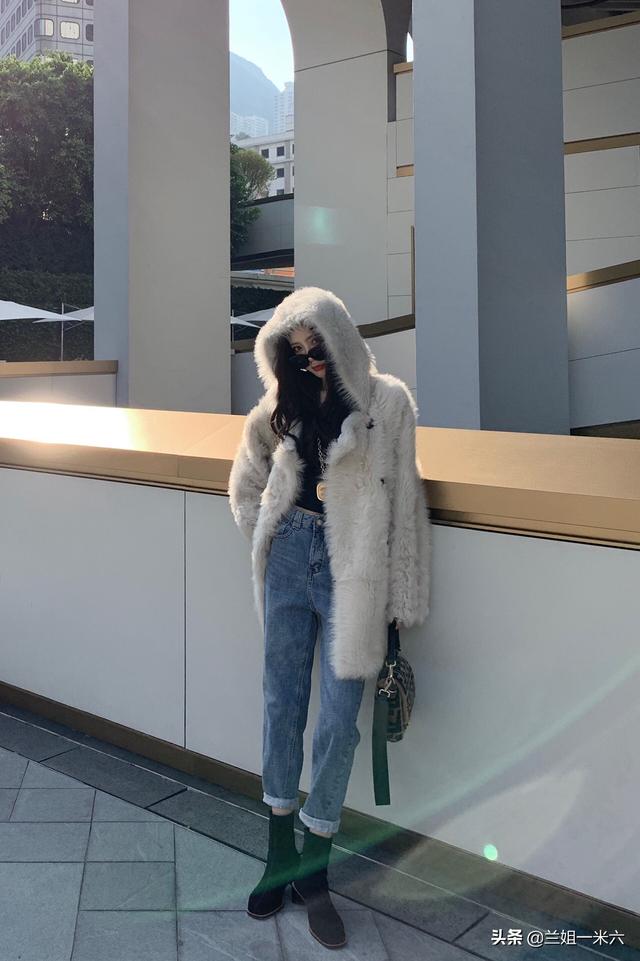 冬天,毛呢搭配黑色超高腰牛仔裤(如图五),显得整个人很文静,很乖巧,满满的初恋感。皮草搭配蓝色宽松哈伦牛仔裤(如图六),保暖效果好,休闲御姐范儿十足。