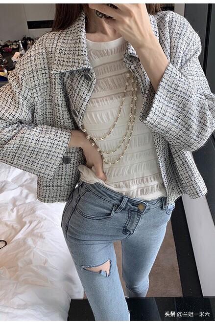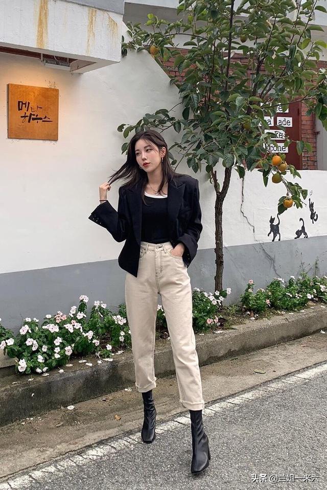 深秋时节,就要加外套了,来看看黑色小西装搭配米白色宽松牛仔裤(如图三),整体显得随性慵懒、很休闲。再来看看御姐范儿的搭配,小香风的短外套搭配浅蓝色的紧身牛仔裤(如图四),显得帅气又优雅。