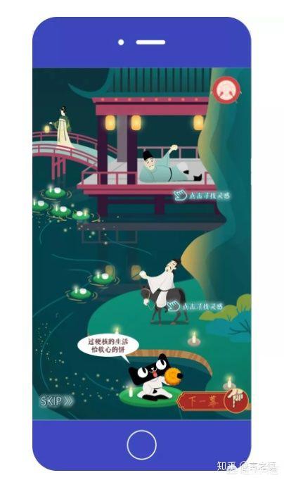 案例分析:玩法:通过介绍月饼来历,告知用户穿越回古代长安,获取灵感。指示用户滑动长页面,分别进入到曲水流觞、花灯迷境、花车斗彩三个场景中,在这三个场景中用户将被要求选择月饼馅料、月饼皮、月饼装饰,将整个做月饼的过程诠释为寻找灵感的美妙旅程。三个场景结束后,参加祭月大典,点击“来点糯米”按钮,天猫洒下糯米粉后进入合成海报阶段。